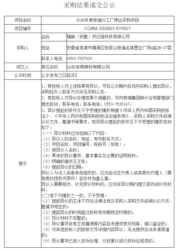 山东世商焊材有限公司荣幸地宣布,中标奇瑞CD厂2026年焊丝采购项目(项目编号:CGXM-202603-0190/1)。